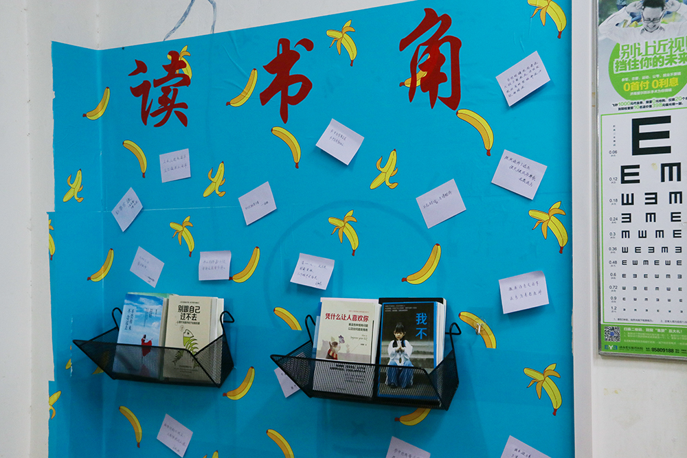 同学们依靠集体智慧与力量,把教室角落充分利用起来,创建各类特色主题,打造班级阅读的独特地带。“蕉泥读书吧”“心视界”“知识驿站”“翰墨书香”“聚言堂”等12个具有创意主题的读书角体现同学们活跃新颖的设计理念与其乐融融的读书氛围。一面面充满个性的文化墙、一排排传递知识的图书、一套套具有创意的书架,将整个读书角装扮的温馨优雅。