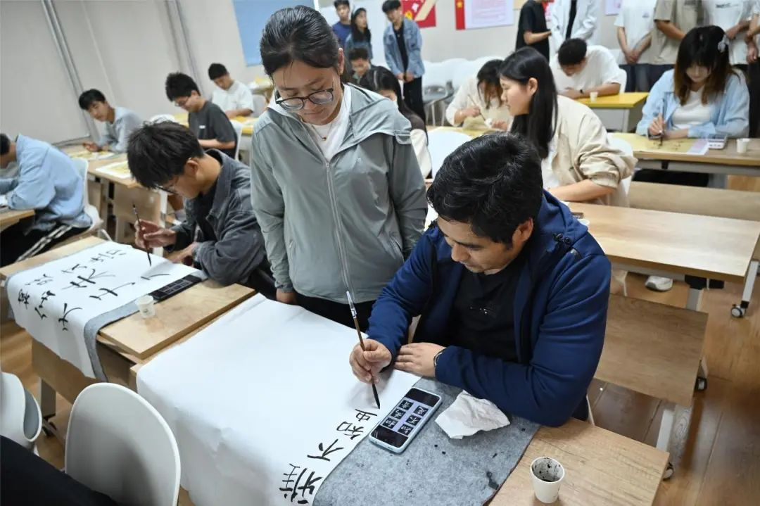 活动现场,毕建波为大家深入讲解了书法字体的独特魅力。随后,他现场示范书法技法,从握笔姿势、笔画顺序,到运笔的轻重缓急、力度控制,每一个细节都进行了细致入微的演示和指导。同学们在毕建波的指导下,逐渐体会到“力透纸背”的意境,点折钩提之间皆展文化之美。