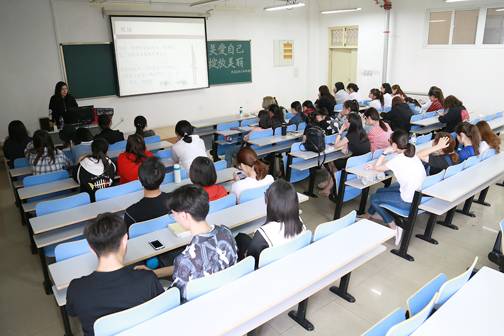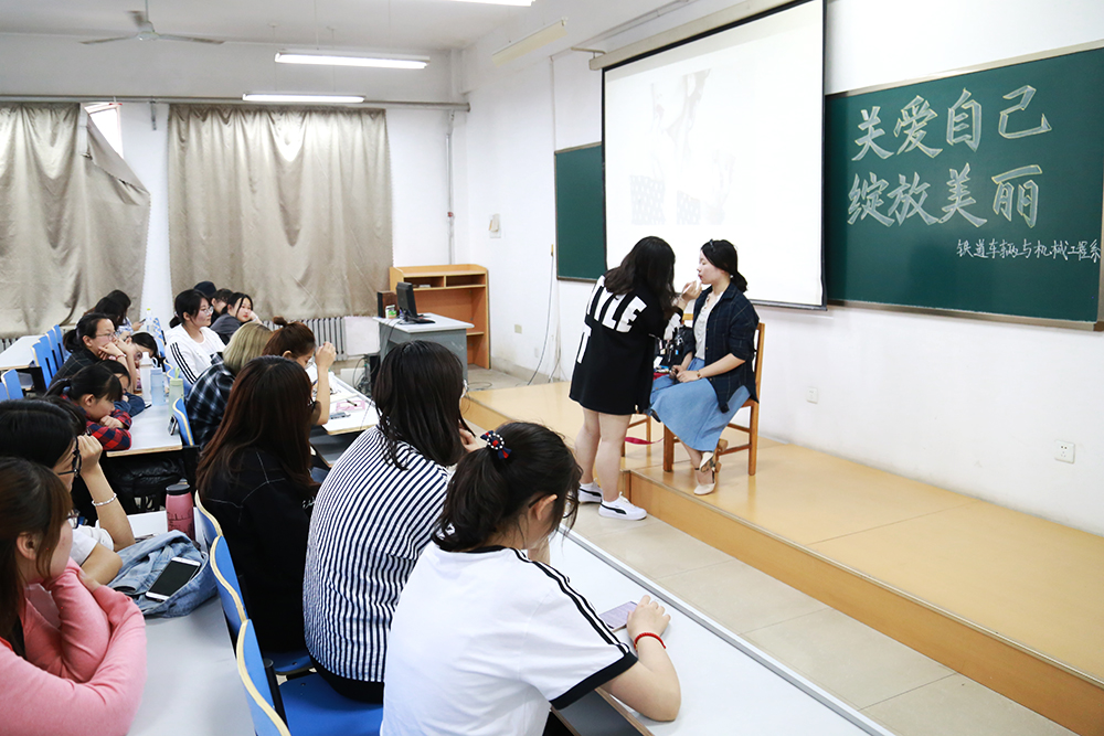 此次讲座的主讲人是铁道车辆1734班的刘佳,获得高级化妆师资格证,学习之余从事化妆已有两年,并开设有自己的玖月美学工作室。刘佳讲述了化妆的重要性,如何选择适合自己的化妆品,化妆的步骤以及化妆时需要注意的事项,并详细讲述了各个步骤具体的做法和顺序。为了更好地让同学们了解自己适合的妆容,她还具体分析了不同脸型的人所适用的化妆品特点,并邀请现场同学亲身示范。