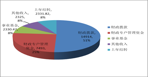 2019年收入预算为29394.29万元,其中:财政拨款14914.00万元,占51%,财政专户管理资金7493.00万元,占25 %,事业基金弥补收支差额2330.47万元,占8%,其他收入2325.00万元,占8 %,上年结转2331.82万元,占8%。