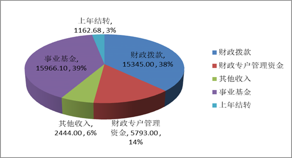 2020年收入预算为40710.78万元,其中:财政拨款15345.00万元,占38%;财政专户管理资金5793.00万元,占14%;其他收入2444.00万元,占6%;用事业基金弥补收支差额15966.10万元,占39%;上年结转1162.68万元,占3%。