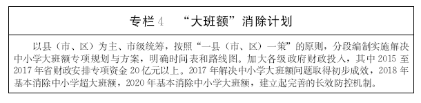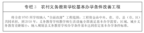 2.推进义务教育优质均衡发展。全面推进均衡发展。加快城乡义务教育学校标准化建设。强化市、县两级政府责任,合理规划城乡学校布局,逐步消除中小学大班额问题,2018年年底前完成农村义务教育学校“全面改薄”任务。构建小学与初中学段纵向衔接、相同学段学校间横向协作的办学模式,实现学区内教师资源、课程建设、设施设备等统筹配置,推进优质资源共建共享。实现义务教育发展基本均衡县全覆盖,推进市域义务教育均衡发展。保障特殊群体受教育权利。