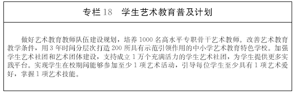 2.切实加强学校美育工作。各级各类学校逐步开齐开足美育课程。开发具有地域特色的地方和校本美育课程。增强中小学美育课程的多样化、选择性,高校增加公共艺术课选修课。教育与文化等部门合作,开展高雅艺术、传统文化进课堂活动,做好学生艺术普及工作。要将美育实践活动纳入教学计划,实施课程化管理,创新学生艺术交流活动,加强学生艺术社团和艺术团体建设,每年举办一次学生人人参与的艺术节。改善美育教学条件,使艺术场地及设施的建设配备达到规定标准。联合和依托文化部门及相关单位,组织选派文艺工作者参与志愿服务项目,鼓励和引导高校艺术专业教师、艺术院团专家和社会艺术教育专业人士到中小学校担任兼职艺术教师。健全中小学生艺术素质测评制度、中小学校美育工作自评和美育发展年度报告制度。到2020年,初步形成大中小幼美育相互衔接、课堂教学和课外活动相互结合、普及教育与专业教育相互促进、学校美育和社会家庭美育相互联系的现代化美育体系。