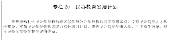 (六)支持和规范民办教育发展。以完善管理体制和政策体系为重点,释放社会力量办学活力,促进民办教育发展,创新和扩大教育服务多样化供给。1.鼓励社会力量兴办教育。将民办教育纳入教育发展总体规划,引导支持社会力量以多种形式兴办教育,提供多样化教育服务。允许社会力量以资本、知识、技术、管理等要素参与办学并享有相应权利。吸引鼓励大中型企业、社会团体参与办学,探索举办混合所有制学校。鼓励公办与民办学校开展资源共享和深度合作。2.优化民办教育发展环境。建立营利性、非营利性民办学校分类管理制度,实施差异化扶持政策。鼓励有条件的地区设立民办教育发展专项资金。落实义务教育阶段民办学校生均公用经费保障机制。依法落实民办学校与公办学校的同等法律地位,注重民办学校教师专业发展,健全民办学校教师社会保障制度。支持民办学校创新办学机制和育人模式,培育一批高水平、有特色的民办学校。3.完善监督管理服务体系。完善民办学校法人治理结构,推动建立民办学校监事会和民办学校管办评分离制度。规范民办学校财务资产管理,探索民办高校学费、财政资金监管专户监管制度。建立健全民办学校风险防范机制与信息公开制度,完善督导评估,探索建立民办学校退出机制。