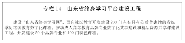 (五)构建终身教育体系。大力发展面向全体社会成员的继续教育,构建惠及全民的终身教育培训体系,加快山东学习型社会建设。