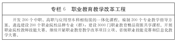 改革课程体系和教学内容。建立产业技术进步驱动课程改革和真实应用驱动教学改革机制,按照科技发展水平、职业资格标准设计课程结构和内容。进一步加强和改进公共基础课教学,将职业道德、人文素养教育贯穿人才培养全过程,提升职业院校学生综合素质和可持续发展能力。完善职业教育专业教学标准,开发专业教学指导方案,制订一批对接紧密、特色鲜明的专业人才培养方案。